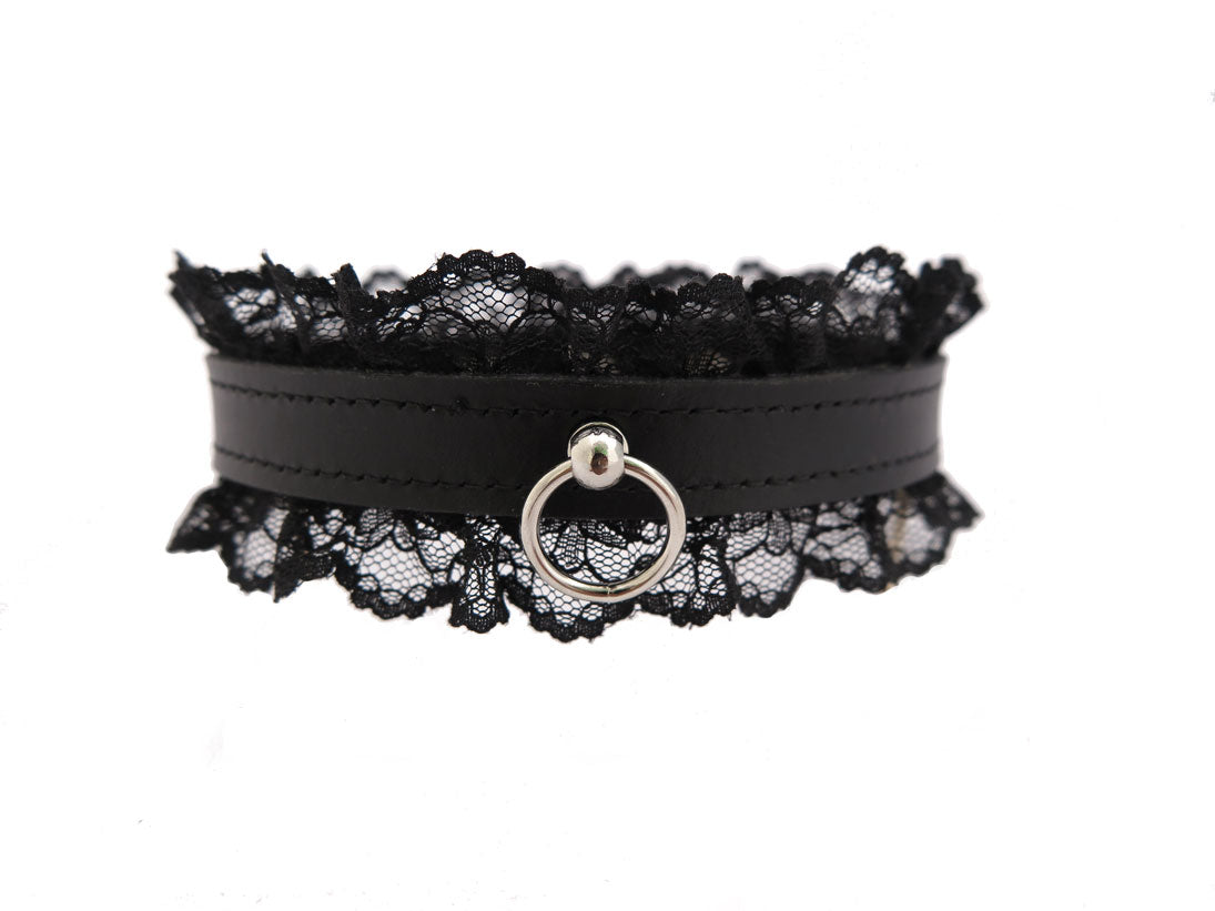 Sexy bdsm collar made from soft and supple leather and black fabric lace edging. The suede interior makes this collar soft on the skin and the stitched edges add a refined and elegant final touch. Adorned with clear gems for decoration and an o ring to attach a lead for light tugging.