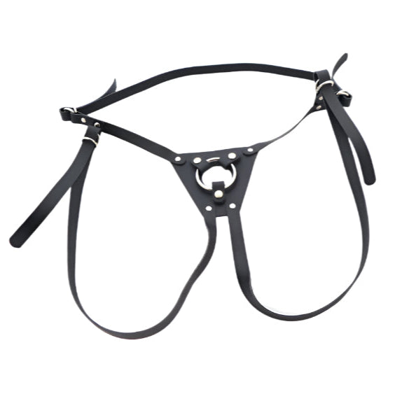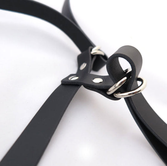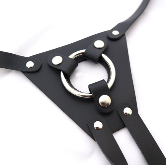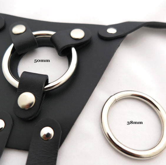 Leather strap on harness made in silky buffalo leather, sturdy yet lightweight. Comes with two metal rings of different sizes to fit a greater range of dildos.