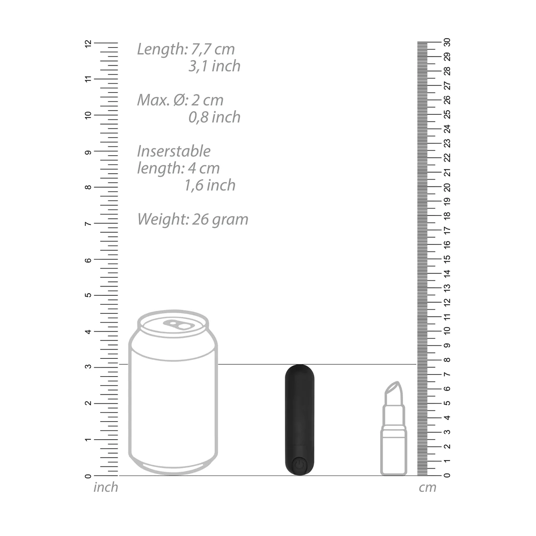 The Bullet Vibrator has a total length of 7.7cm, 2cm  in diameter with an insertable length of 4cm.